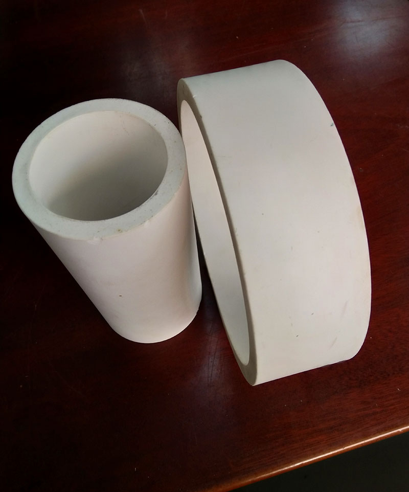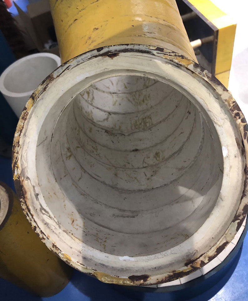整體陶瓷耐磨管內部是高溫燒制的陶瓷管,一體成型,耐磨性好,抗沖擊,其洛氏硬度可達HRC80-90,僅次于金剛石。并且可以開磨具生產,根據現場情況定制陶瓷管壁厚、長度等參數。再將定制的陶瓷管放入鋼管中,并用專用膠粘牢。